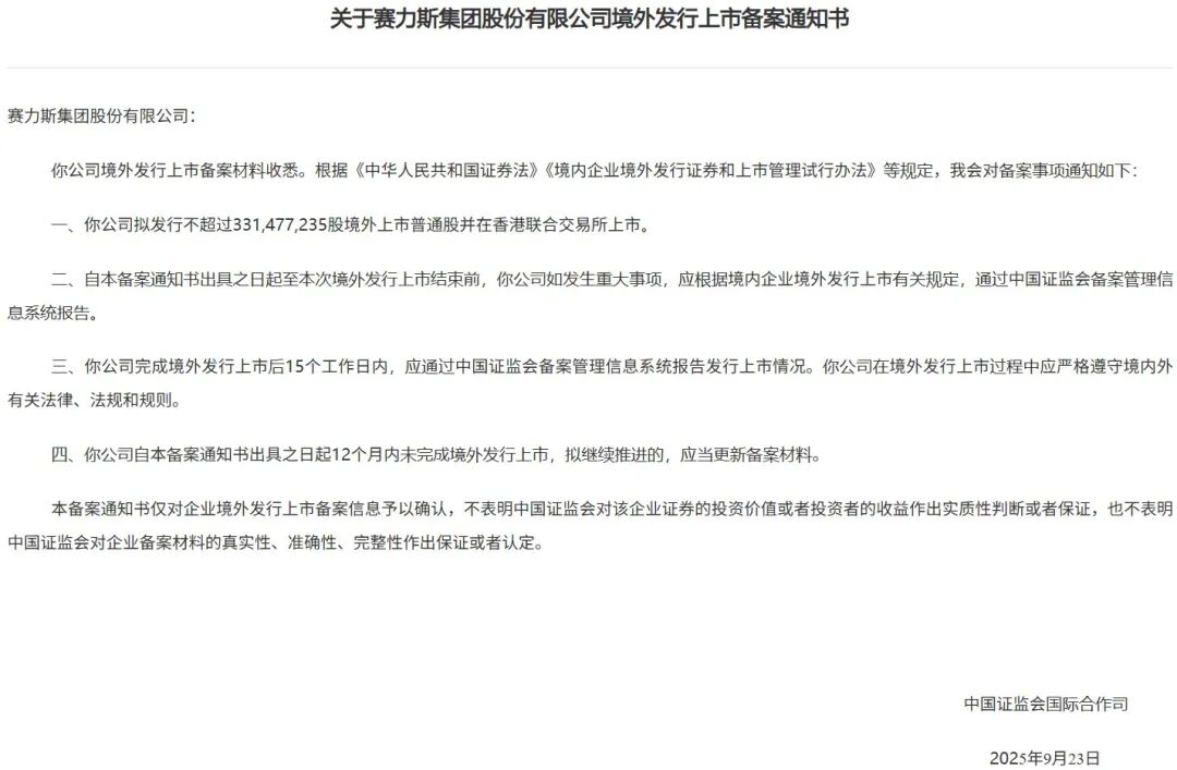 9 月25日,中国证监会国际合作司发布《关于赛力斯(601127)集团股份有限公司境外发行上市备案通知书》。赛力斯(601127.SH)拟发行不超过331,477,235股境外上市普通股并在香港联合交易所上市。